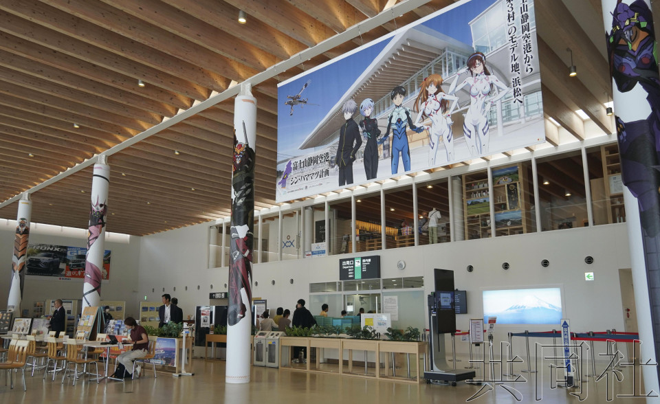 【共同社10月4日電】在日本靜岡機場(靜岡縣牧之原市),電梯、柱子、樓梯等內部全都裝飾上了人氣動畫《新世紀福音戰士》(EVA)的登場人物等,到訪的粉絲大飽眼福。作為劇場版取景地的濱松市與EVA合...