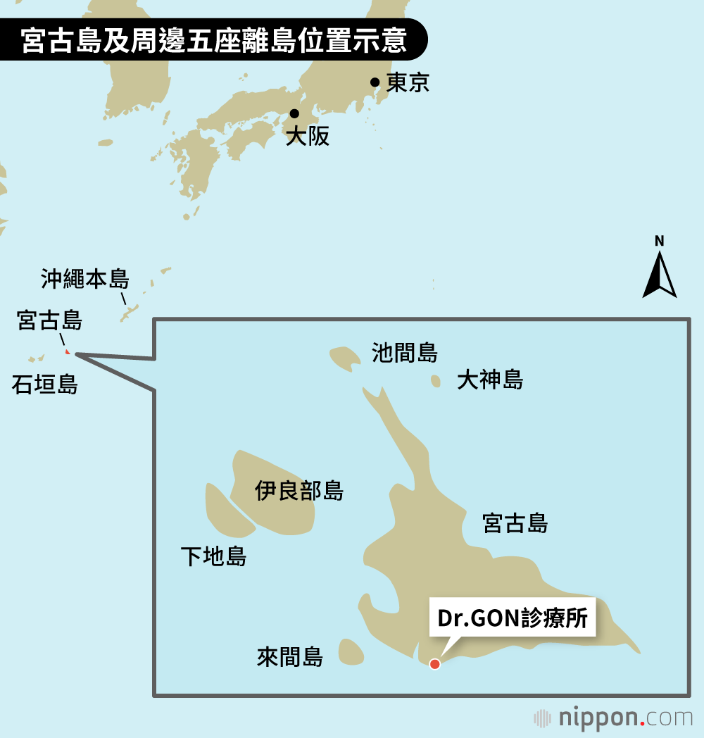 Dr.GON診療所的服務範圍涵蓋宮古島及周邊五座離島。2015年伊良部大橋通車後,宮古島與其中四座島嶼已能透過橋梁往返,交通便利性大幅提升;唯獨大神島仍只能仰賴海上交通,且定期船班時常因天候停航。正因到宅醫療的難度極高,Dr.GON更下定決心,不論自己年紀多大,都要守護這座島嶼,直到最後一位居民。