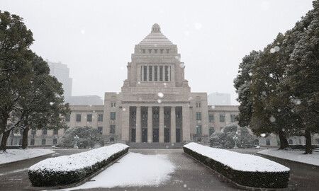 迎來眾院選投開票日、被積雪覆蓋的國會議事堂。8日上午於東京永田町