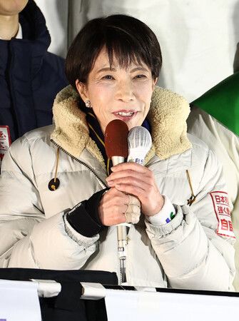 選戰最後一天,進行街頭演說的高市早苗首相(自民黨總裁)。7日晚間於東京都世田谷區