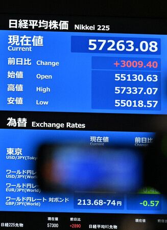 週一開盤的9日東京股市,受眾院選自民黨壓倒性勝利影響帶動買氣加速,日經平均指數終場較前週末大漲2110圓26錢,收在5萬6363圓94錢,刷新歷史最高紀錄。市場對於首相高市早苗推動景氣刺激政策的期待,使「高市交易」再度引燃。日經平均指數盤中一度狂飆超過3000點,甚至出現突破5萬7000點的場面。