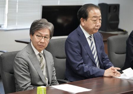 出席中道改革連合幹部會議的共同幹事長安住淳(左)。右為共同代表野田佳彥。9日下午於東京永田黨本部