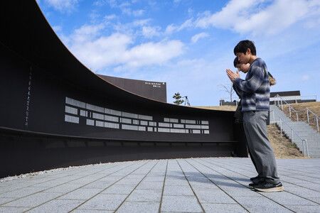 東日本大震災15週年前夕,民眾在石卷南濱海嘯復興祈念公園合掌。後方為震災遺構門脇小學。10日下午於宮城縣石卷市