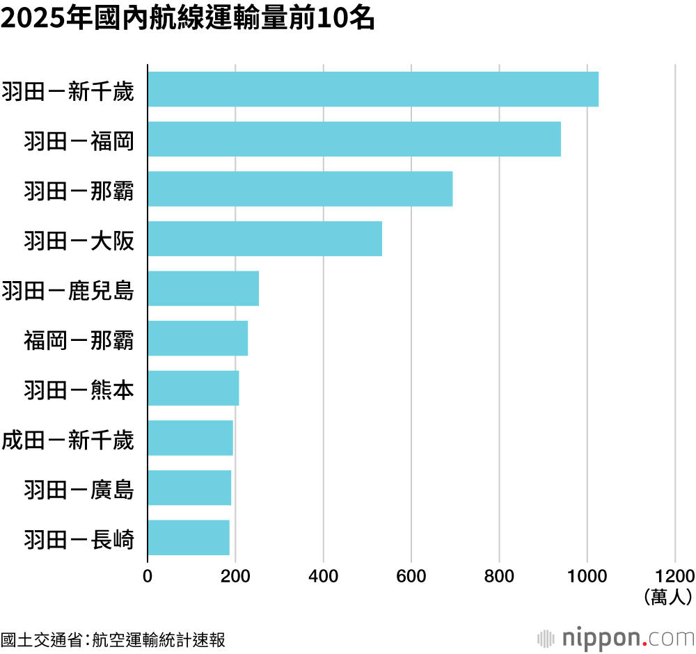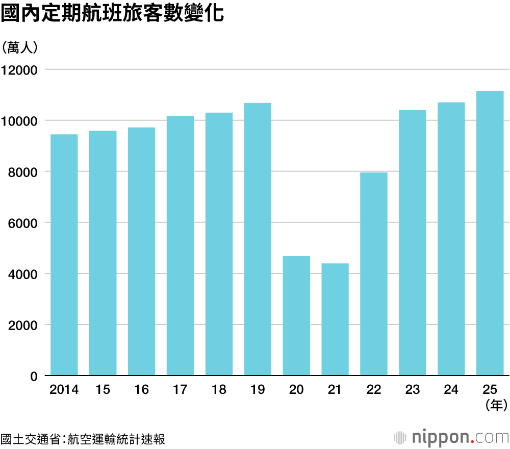 2025年國內航空運輸:旅客數年增4.2%至1億1147萬人——國土交通省統計