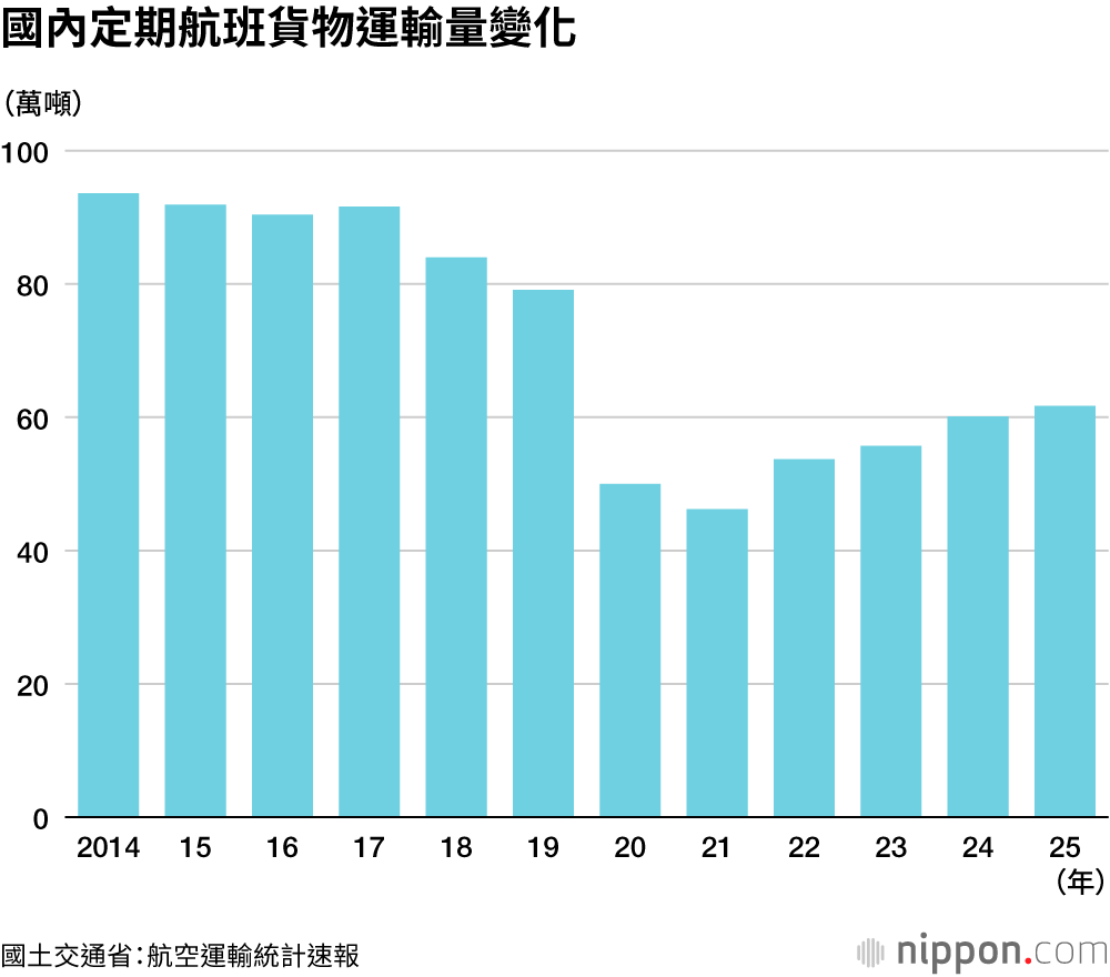 在疫情前的2019年,國內航線旅客數為1億667萬人,而2025年已連續第2年超越該水準。另一方面,貨運量與疫情前每年約80萬至90萬噸相比,仍僅恢復至約7成。