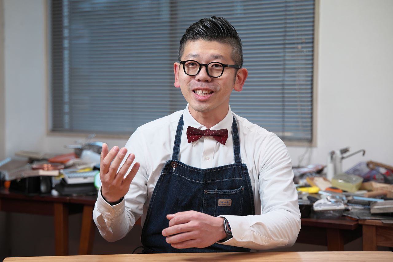 在料理烹調用具研究室裡接受採訪的飯田先生。他曾鍥而不捨地持續向各廠商探詢合作意願