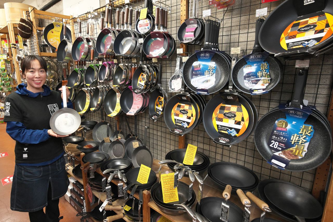 工作人員手持不鏽鋼製的EVER GRILL。賣場裡陳列著各式各樣的平底鍋