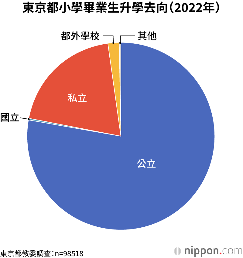 東京都教育委員會發佈的《2023年公立學校統計調查報告》顯示,2023年3月都內公立小學畢業生為9萬8518人。其中7萬6611人(77.8%)升入了都內公立國中,1萬9521人(19.8%)升入了都內私立國中。此外,443人升入了國立國中,1769人升入了都外的國中。入學國立和私立國中的學生比例為20.2%,超過了2成。據分析,入學都外學校的學生多數是通過考試升學到鄰縣的私立國中。