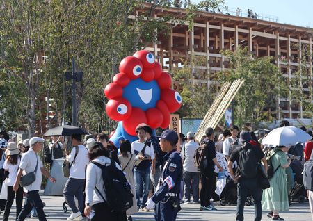 遊客聚集在大阪・關西萬博官方吉祥物「脈脈」塑像前。攝於10月7日,大阪市此花區