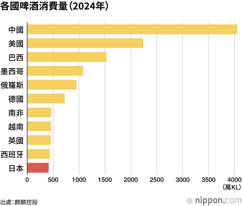 從國家來看,中國的消費量同比減少3.7%,但從2003年以來連續22年雄踞全球首位。日本在2020年以前曾連續14年位列第7,但之後的排名緩慢下滑,2024年同比減少2.7%至413.5萬KL,排在全球第11位。