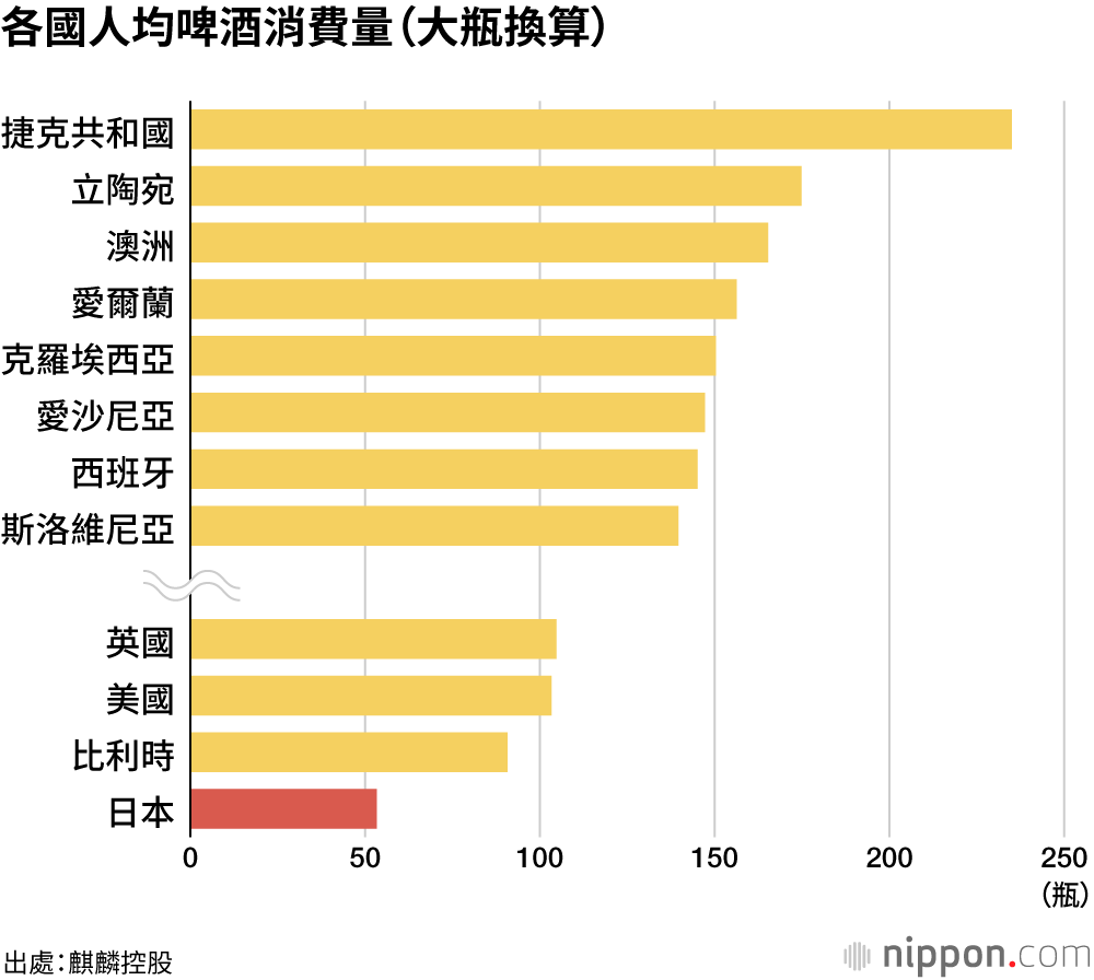 從各國的人均消費量來看,捷克共和國人均消費148.8L(相當於235.0瓶),自1993年以來已連續32年位居第1。日本人均消費33.7L,按大瓶換算同比減少1.2瓶至大約53.3瓶,尚不及捷克的4分之1。