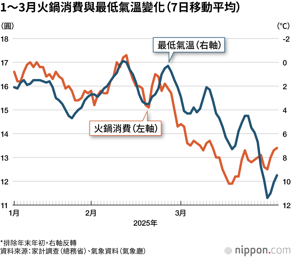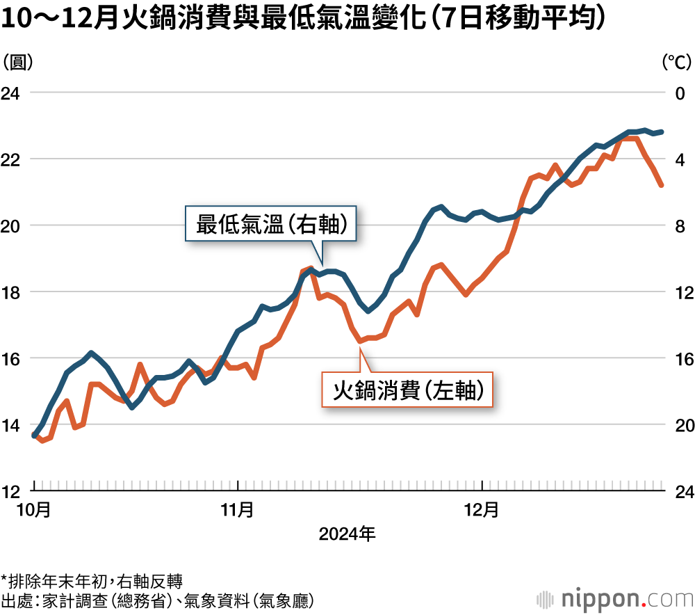 經濟產業省經濟解析室於2026年1月,根據已公布的統計與資訊發表分析結果。分析中將「湯底、醬料」視為火鍋料理的消費支出,並解讀其與氣象廳觀測到的東京都最低氣溫之間的關係。