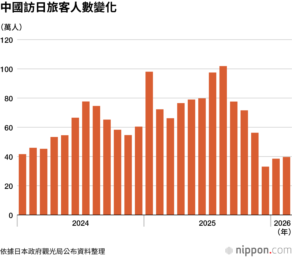 另一方面,中國方面因去年11月日本首相高市早苗發表「臺灣有事」相關言論後,赴日旅遊的自我克制氛圍升高,導致訪日人數大幅減少45.2%,降至39萬6400人。自去年12月以來,已連續3個月停留在30萬人區間的低水準。