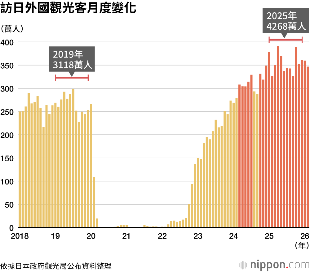 日本政府觀光局公布的2026年2月訪日外國旅客人數(估算值)為346萬6700人,較去年同月增加6.4%,刷新歷年2月最高紀錄。去年春節在1月下旬開始,今年則在2月中旬,因此來自亞洲地區的訪日旅客大幅增加。韓國108萬6400人(增加28.2%)、臺灣69萬3600人(增加36.7%)、香港23萬3900人(增加19.6%)、美國21萬9700人(增加14.7%)等,在主要23個市場中有18個市場創下歷年2月新高。