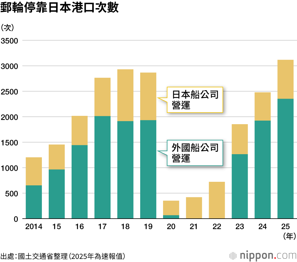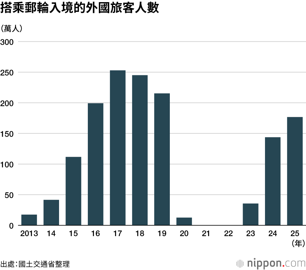 日本政府為振興郵輪產業,曾設定2025年的目標為「訪日郵輪旅客250萬人」「外國郵輪停靠次數超過2000次」,但旅客人數未能達標。