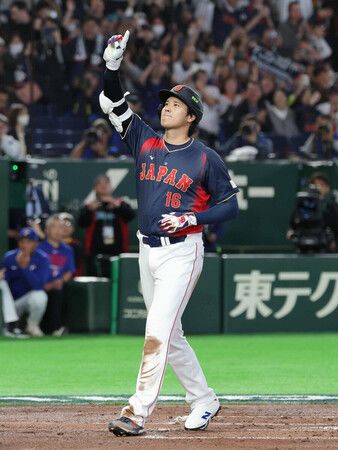 在WBC預賽對台灣之戰中,日本代表隊大谷擊出滿貫全壘打後顯露喜悅。6日於東京巨蛋