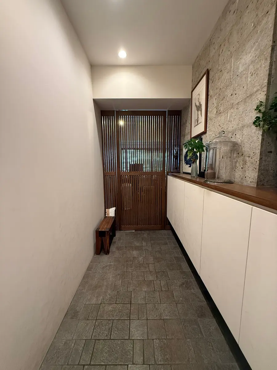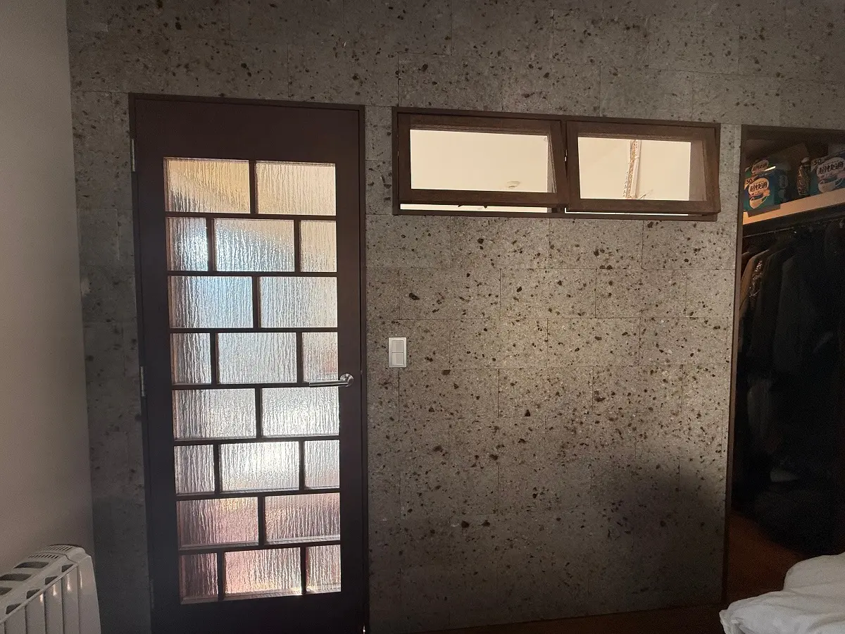 リビング的洋室側壁面は大谷石的タイル貼り。