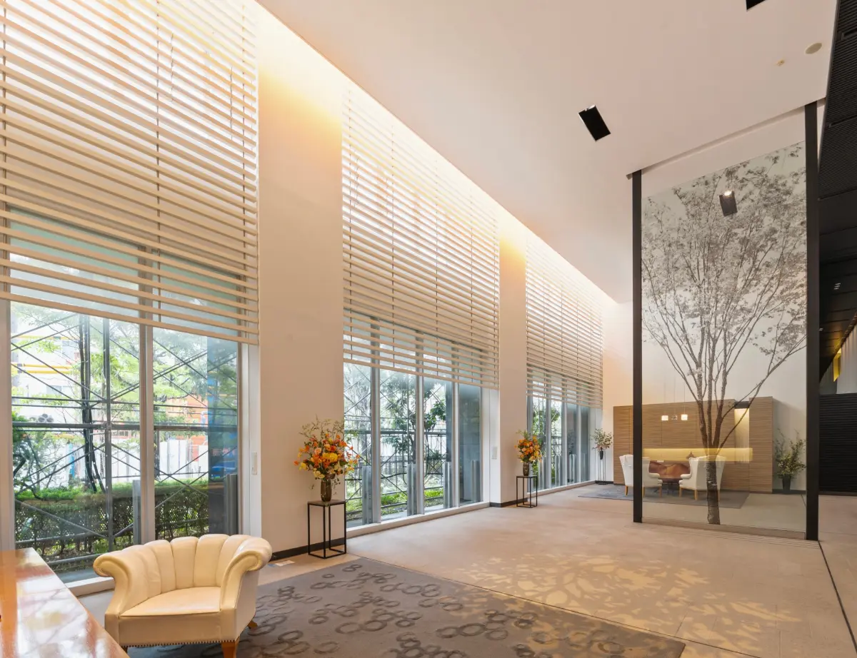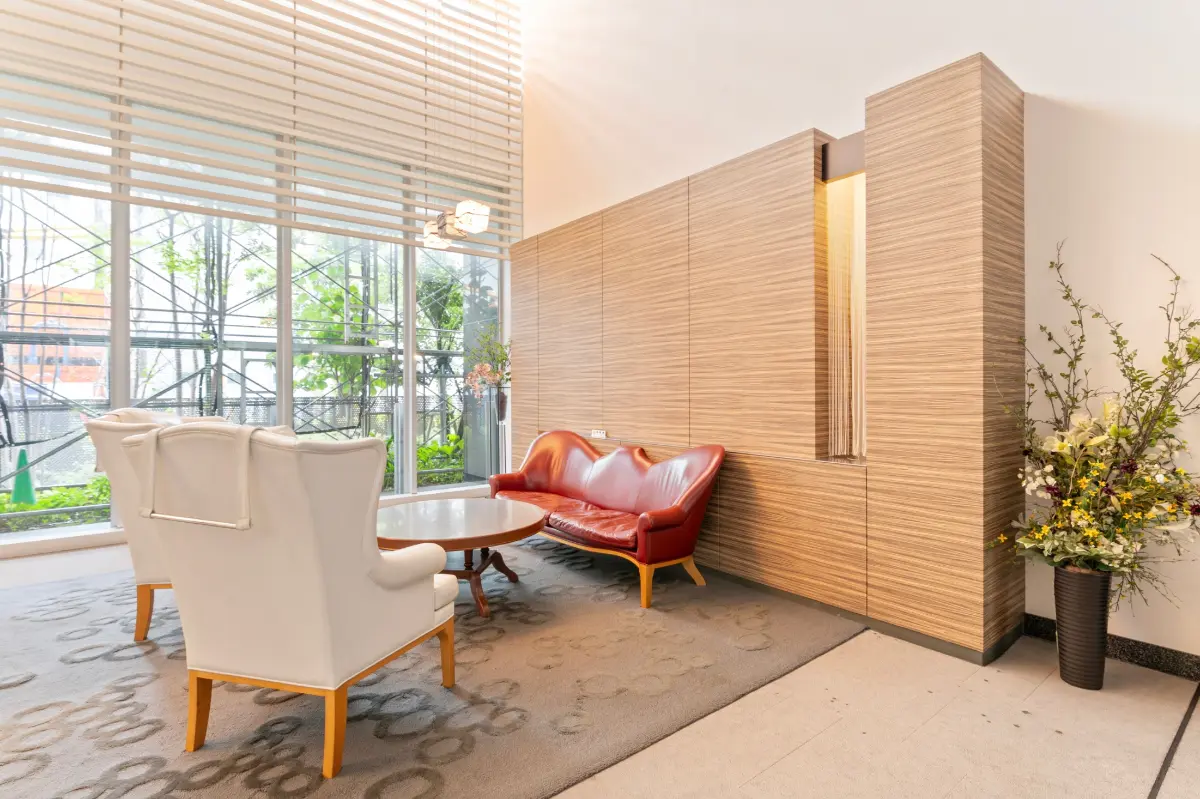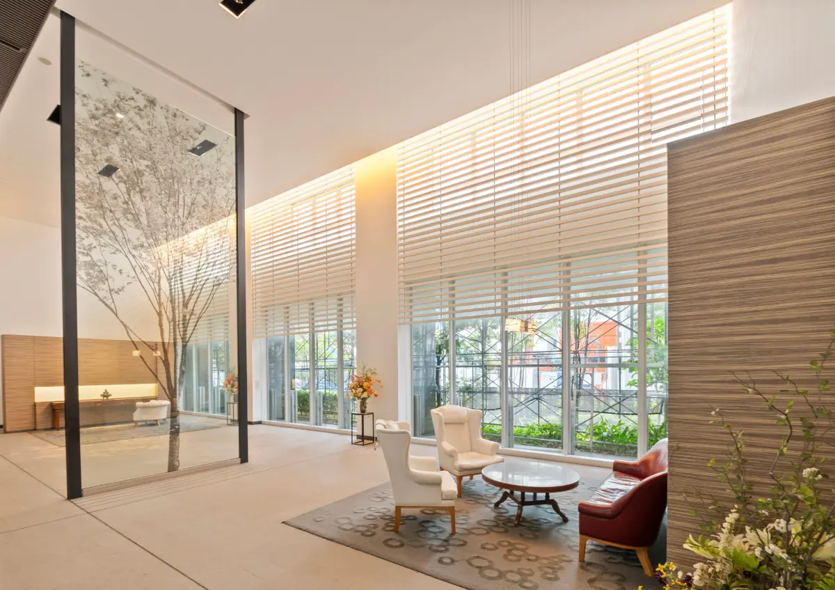 防犯性能の高い非接触キーで開けられるエントランスをくぐると、開放感を感じる天井高6m、2層の吹抜けロビーが居住者を迎えます。