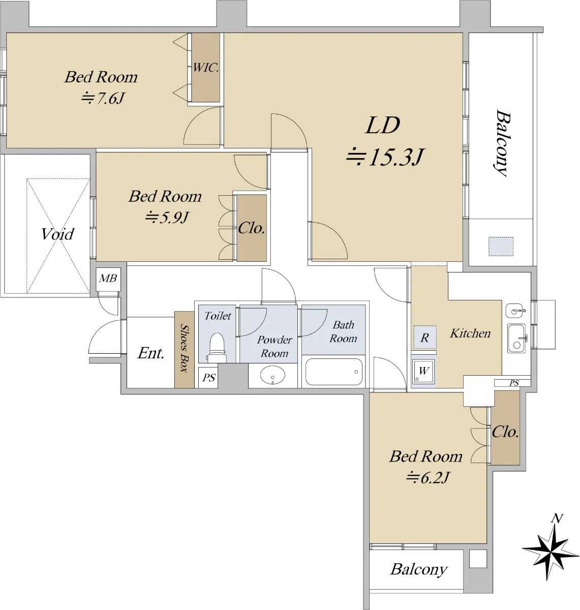 専有面積92.14㎡の3LDK、三方角部屋(南・東・西)につき陽当り、通風良好です。