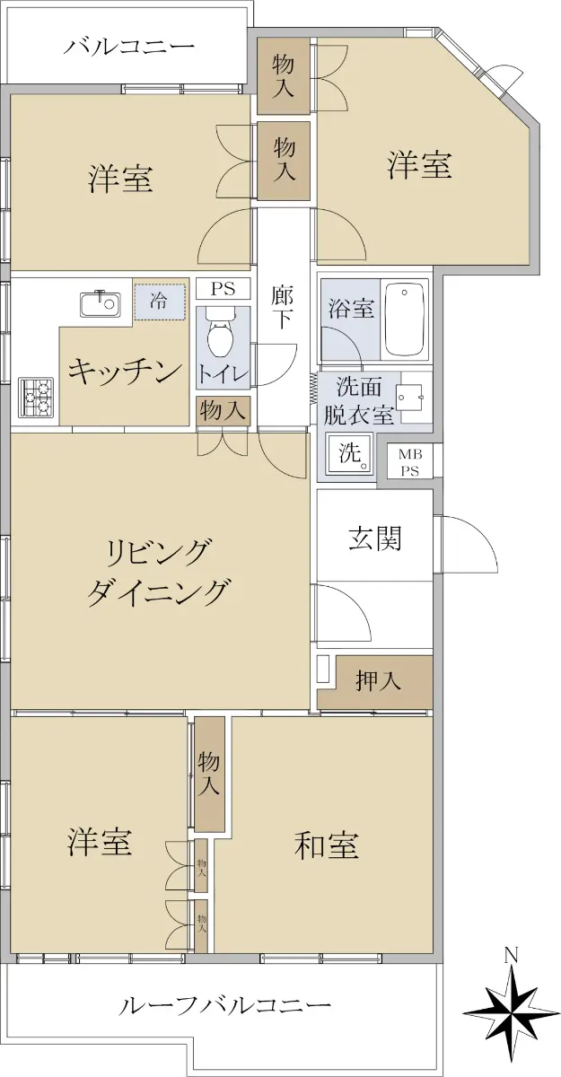 お部屋は南、西、北と3方向に採光があり、ルーフバルコニーがある点も魅力です。