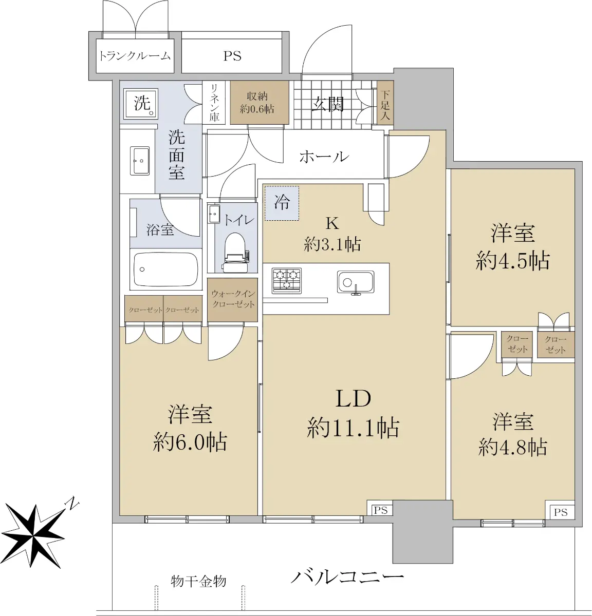 専有面積68.60㎡(トランクルーム面積1.23㎡含)、