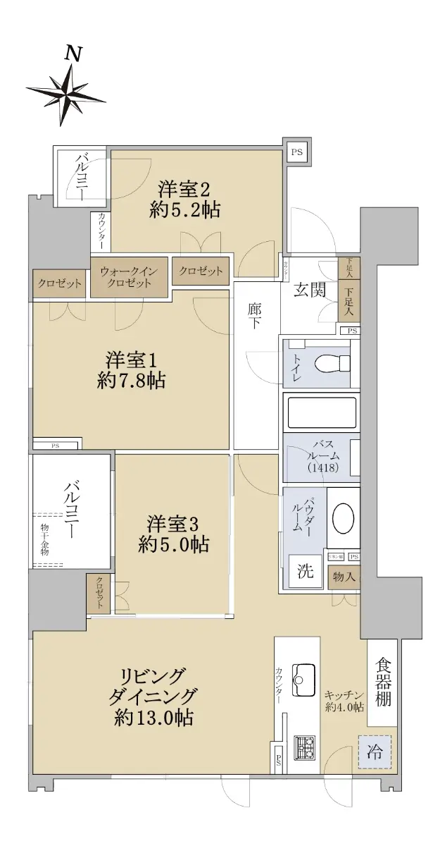 間取りは3LDKで、専有面積は77.78㎡(壁芯)でございます。