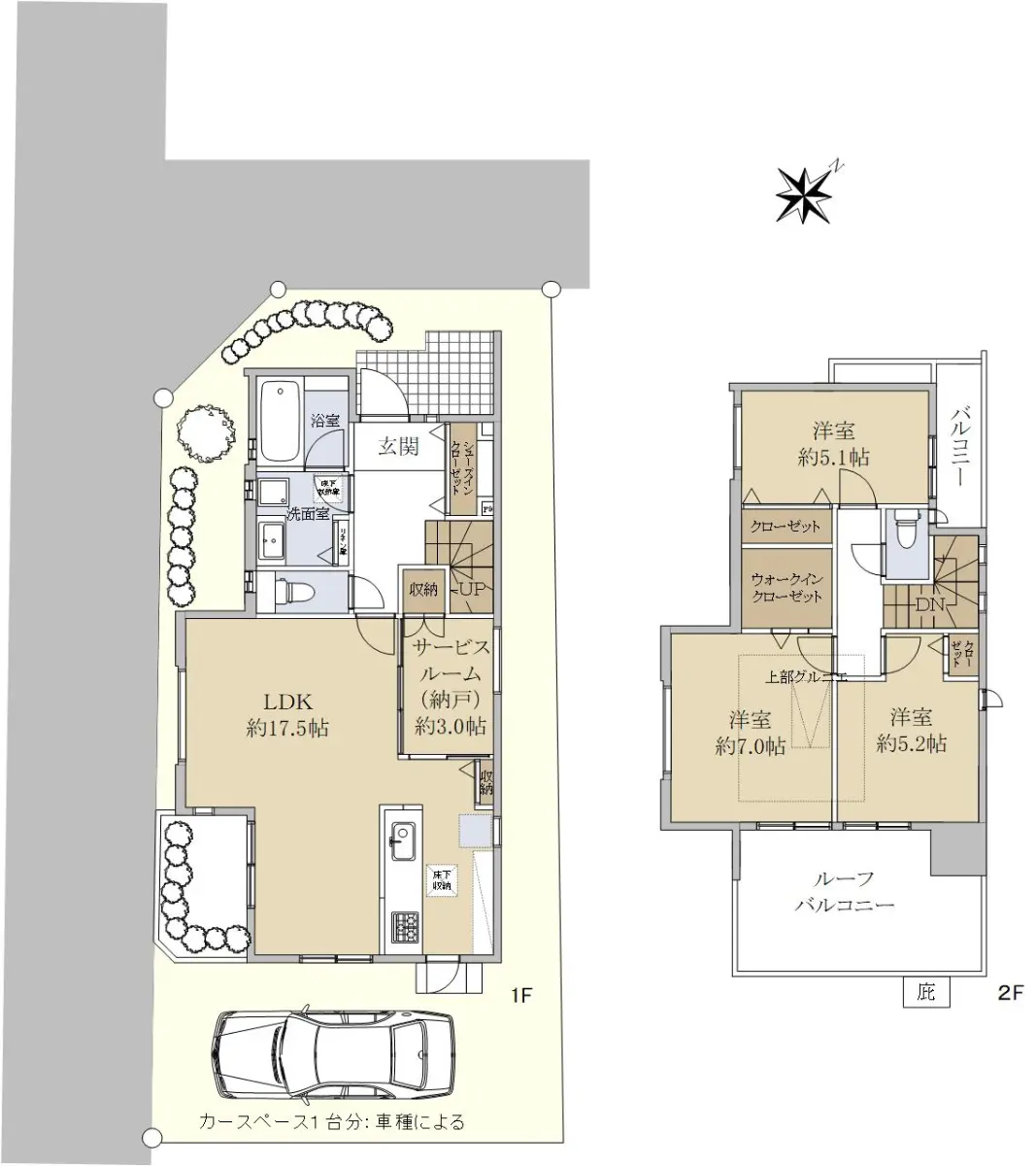 1階には陽当り良好なLDK、納戸があり、ウォークインクローゼットやシューズインクローゼット、グルニエ等の豊富な収納があるため、ゆとりが感じられます。