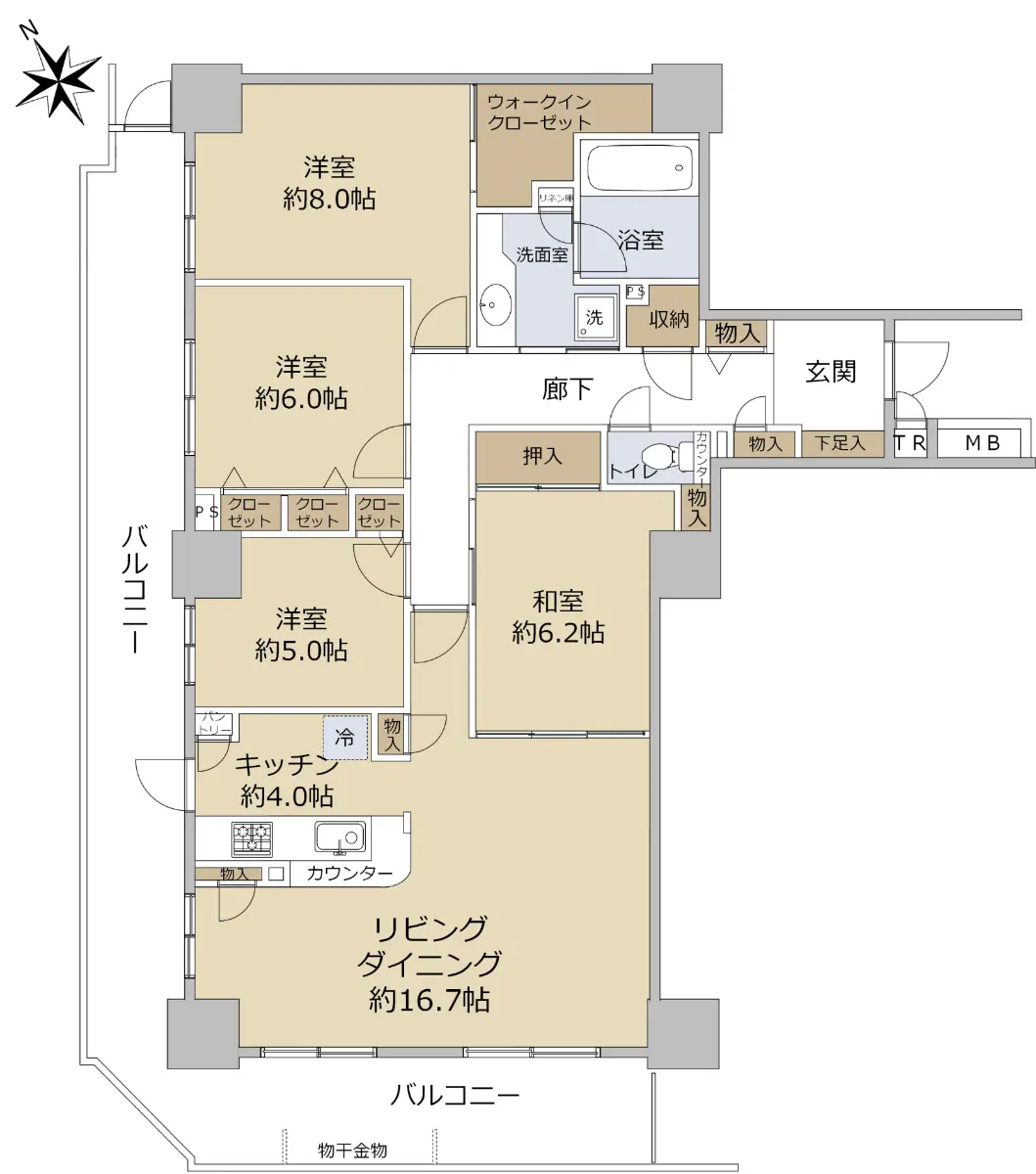 また4LDKの間取りには洋室約8.0帖にウォークインクローゼットがあるほか、各居室に収納があり、