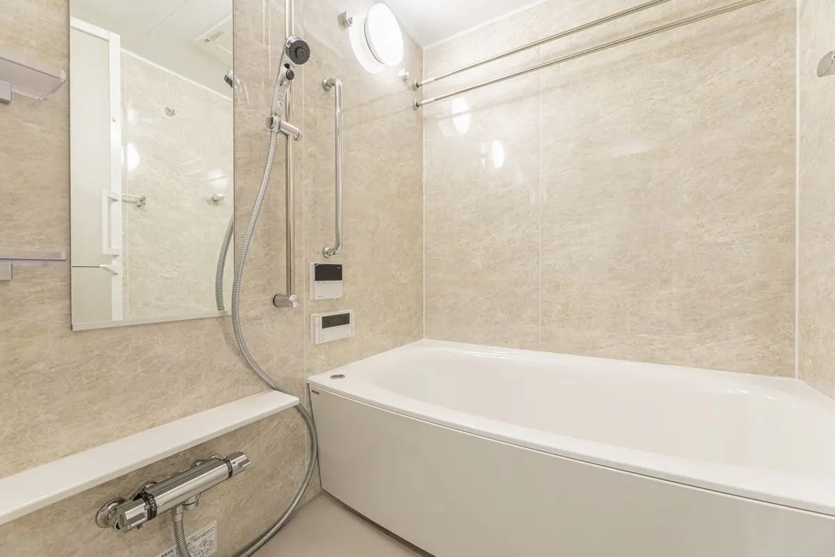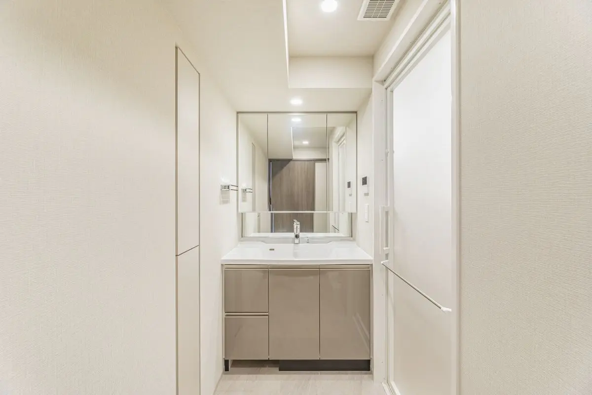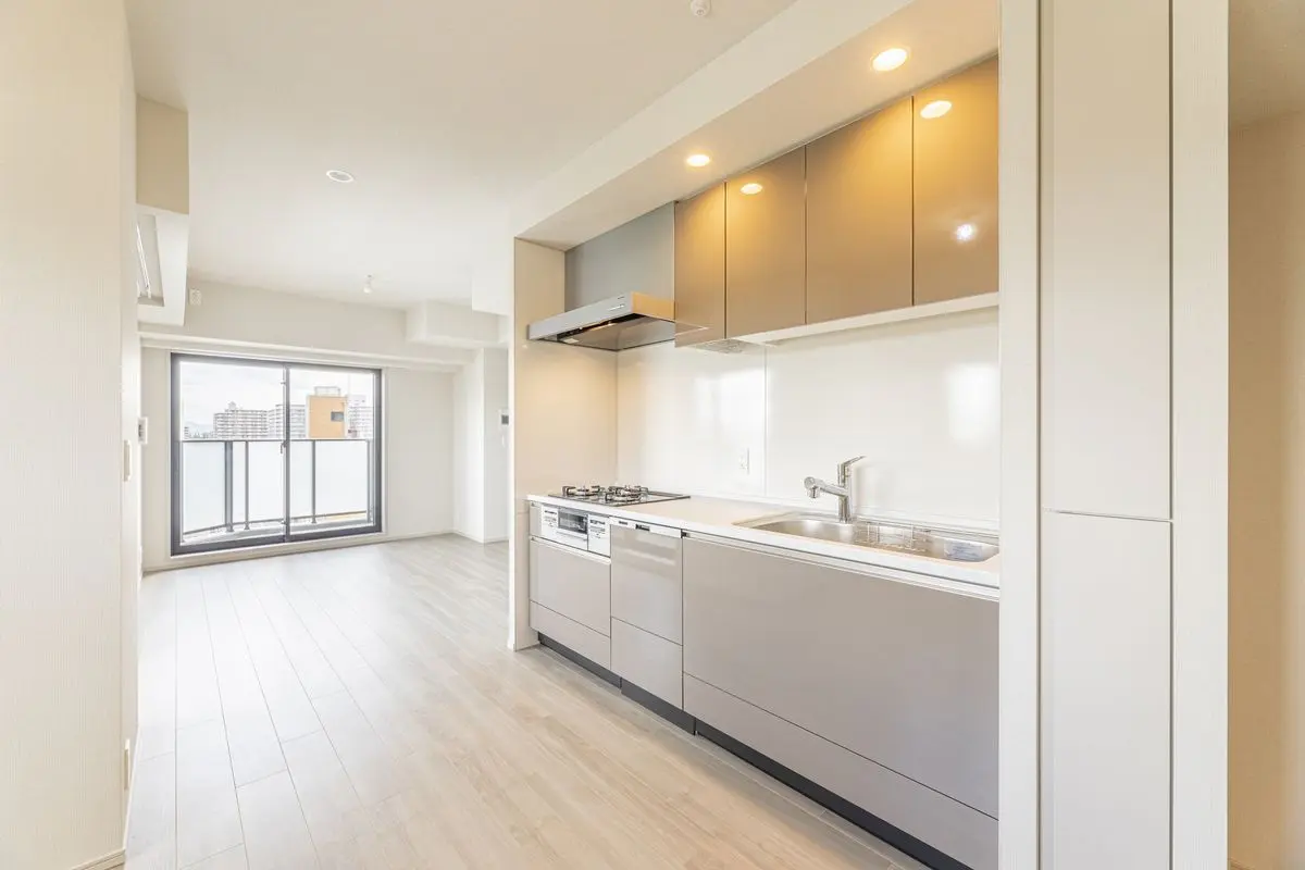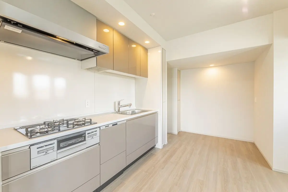 キッチンに浄水器一体型シャワー水栓、食器洗い乾燥機、ディスポーザーが設置されており、シンクは静音シンクが使用されており、水道水がシンク表面にあたる音を低減します!
