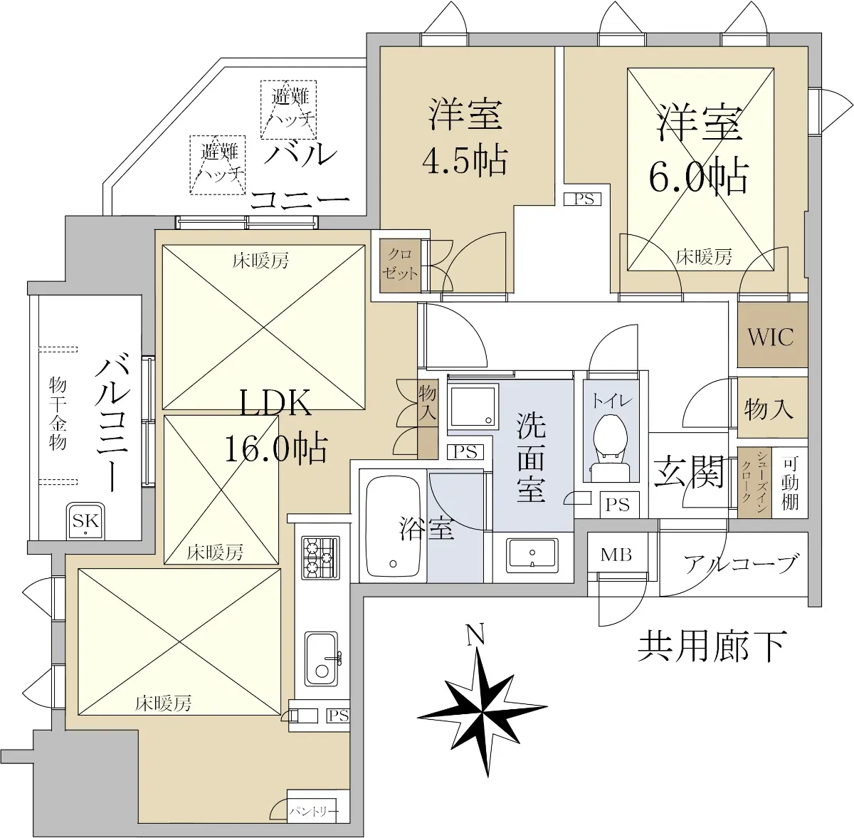 リビング・ダイニング・洋室6.0帖にガス温水床暖房ヌックが設置されており、
