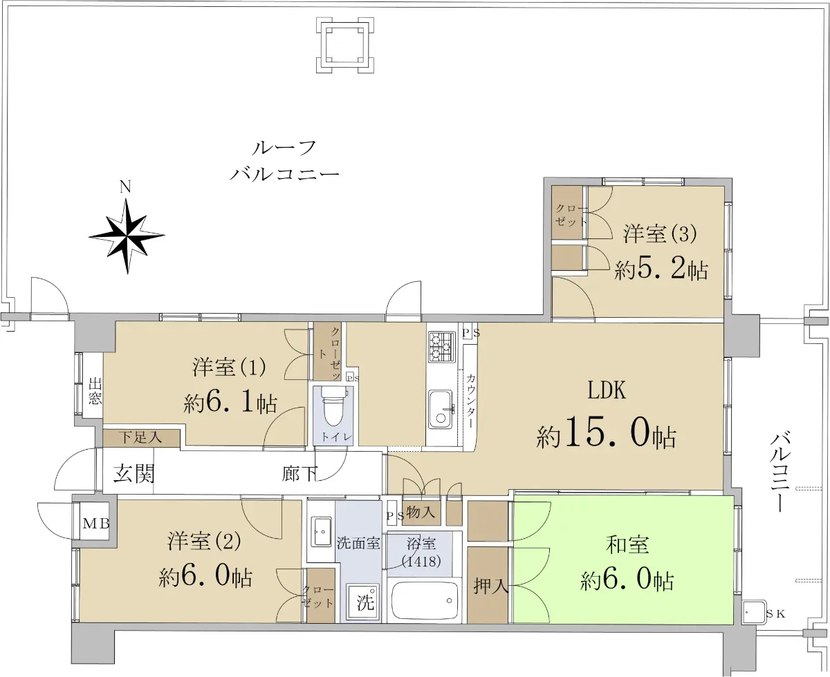 東側バルコニーに加え、北側には86.93㎡の大型ルーフバルコニーがあります。