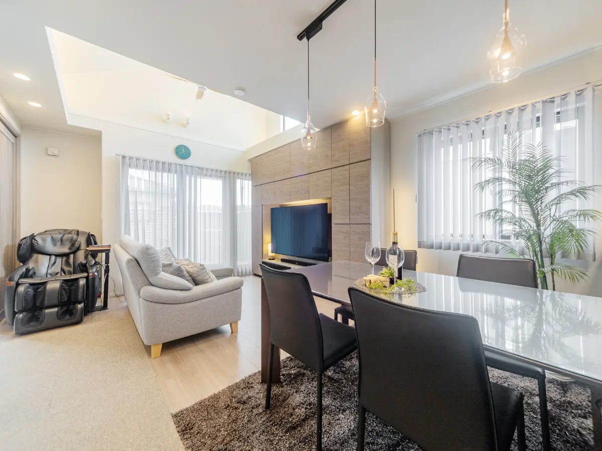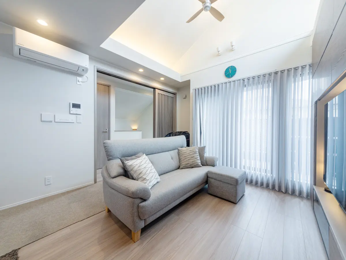 2階のLDKは天井が高く開放感があり、シーリングファンもついております。