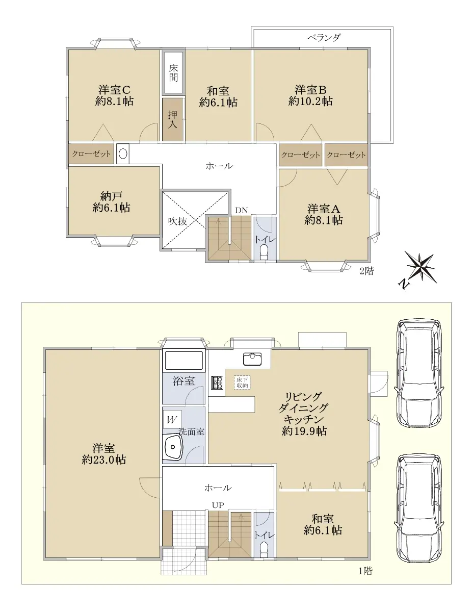 (LDK約19.9帖/1階洋室約23.0帖/ 1階和室約6.1帖/2階北側洋室約8.1帖/2階南西側洋室約10.2帖/2階南東側洋室約8.1帖/2階和室約6.1帖/2階納戸約6.1帖)<