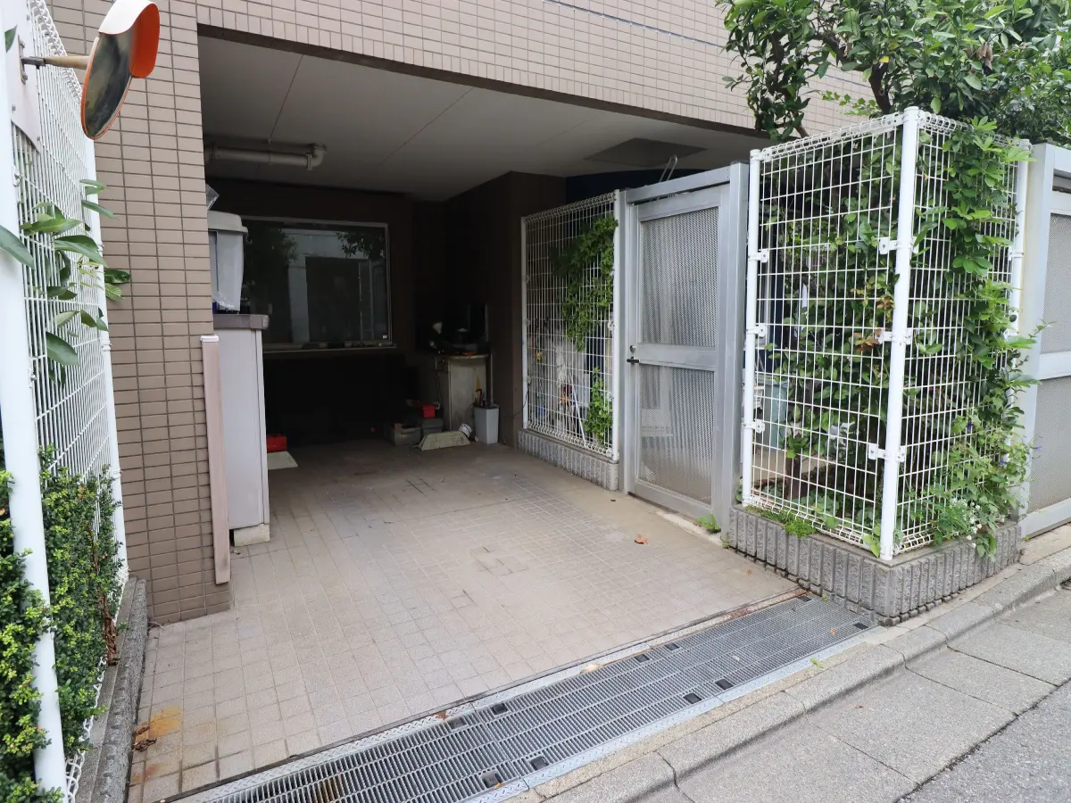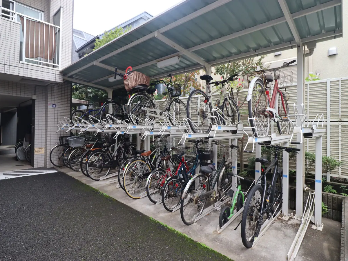 専用の駐車場(屋根有り)や、玄関前の廊下と共用廊下から出入りできる専用の駐輪場。