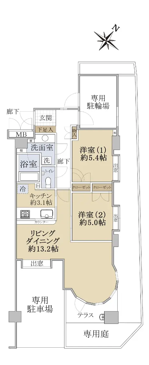 スロップシンク付のテラスと専用駐車場に出入り可能な専用庭が用意されており、1階部分特有の魅力が詰まっています。