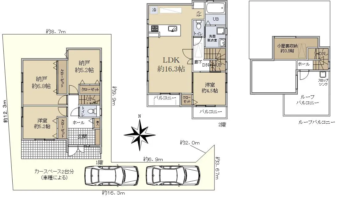 ◆カースペース2台分(車種による)