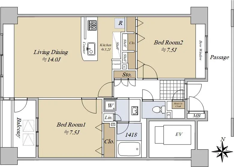 間取りは2LDK(洋室:約7.5帖×2室、LD:約14.0帖、K:約3.2帖)となっております。