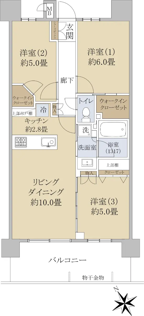 間取りは3LDK、全ての居室に収納がある事は勿論、廊下部分にも収納があり、収納力が高い物件です。