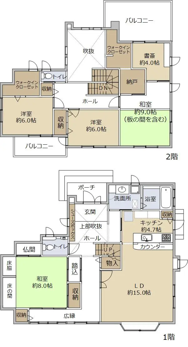 間取は書斎を含め5LDKで、2階にはウォークインクロゼットが二つあるので収納豊富な造りとなっております。