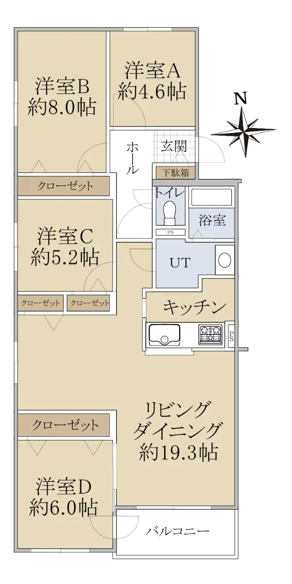 専有面積96.77㎡ 4LDKの間取りの為、ゆとりのある室内空間です。