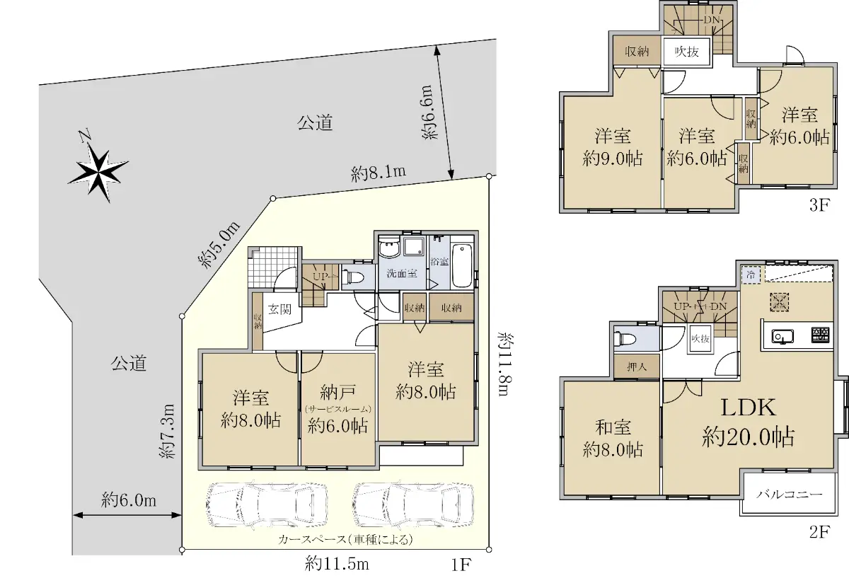 1階:57.13㎡ 2階:56.31㎡ 3階:45.54㎡