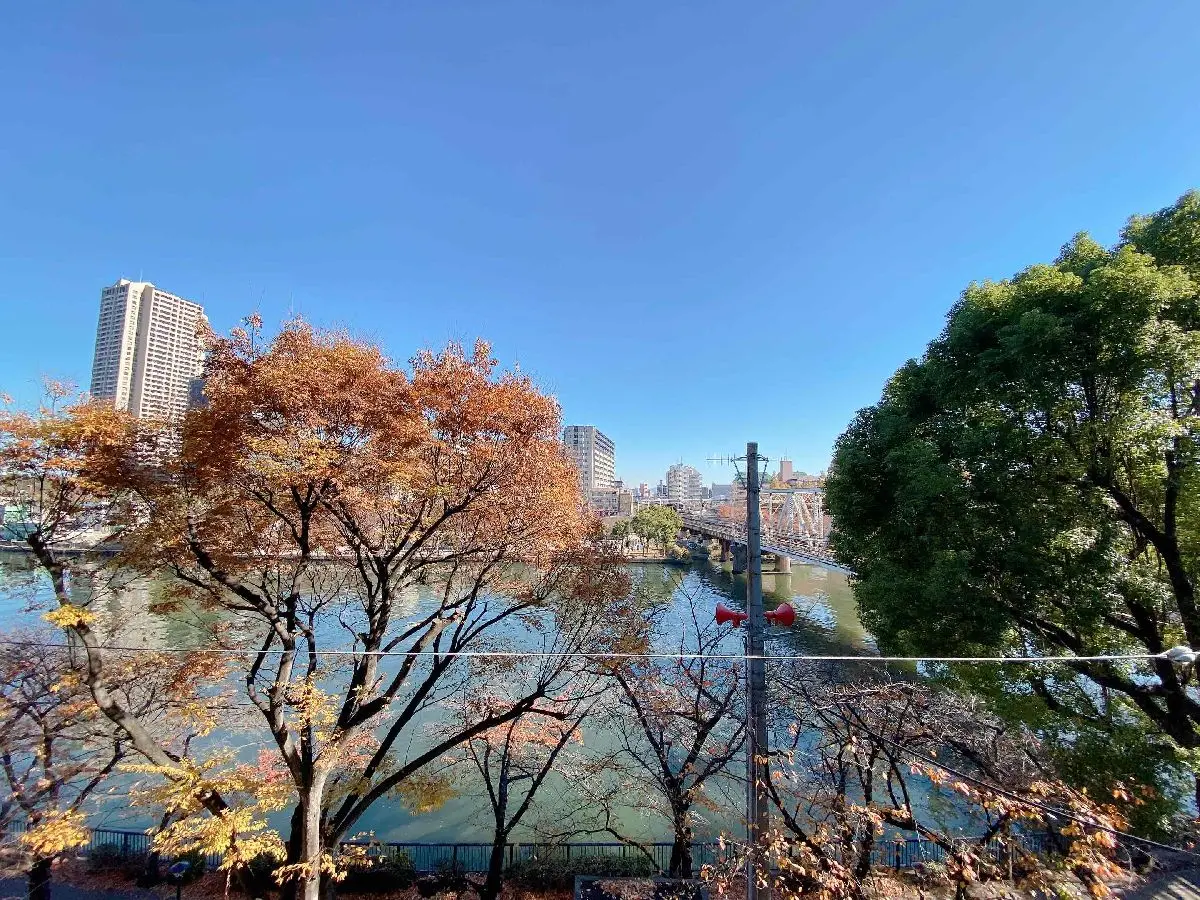 大川に隣接し、河川敷からは天神祭りの花火大会が望めます。