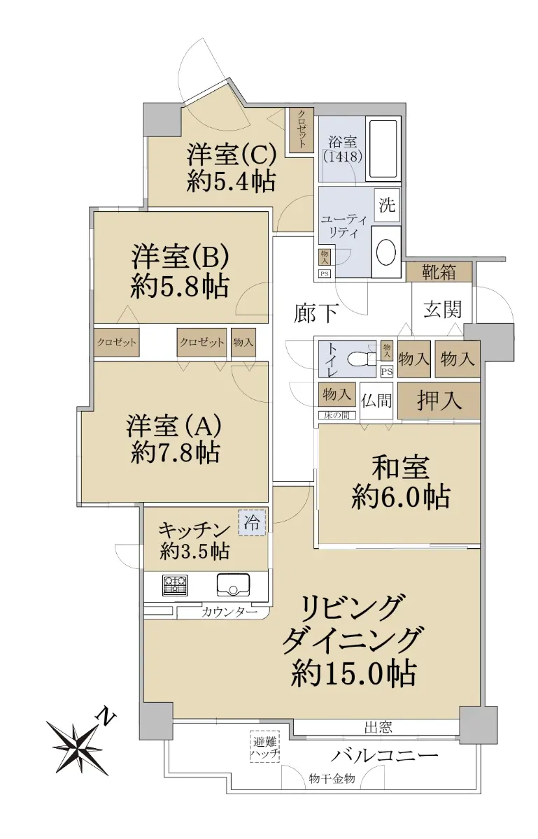 専有面積99.99㎡、南東向きの角部屋です。