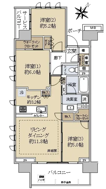 ■サービスバルコニー面積:3.25㎡、ポーチ面積:3.48㎡(専有面積に含まず)