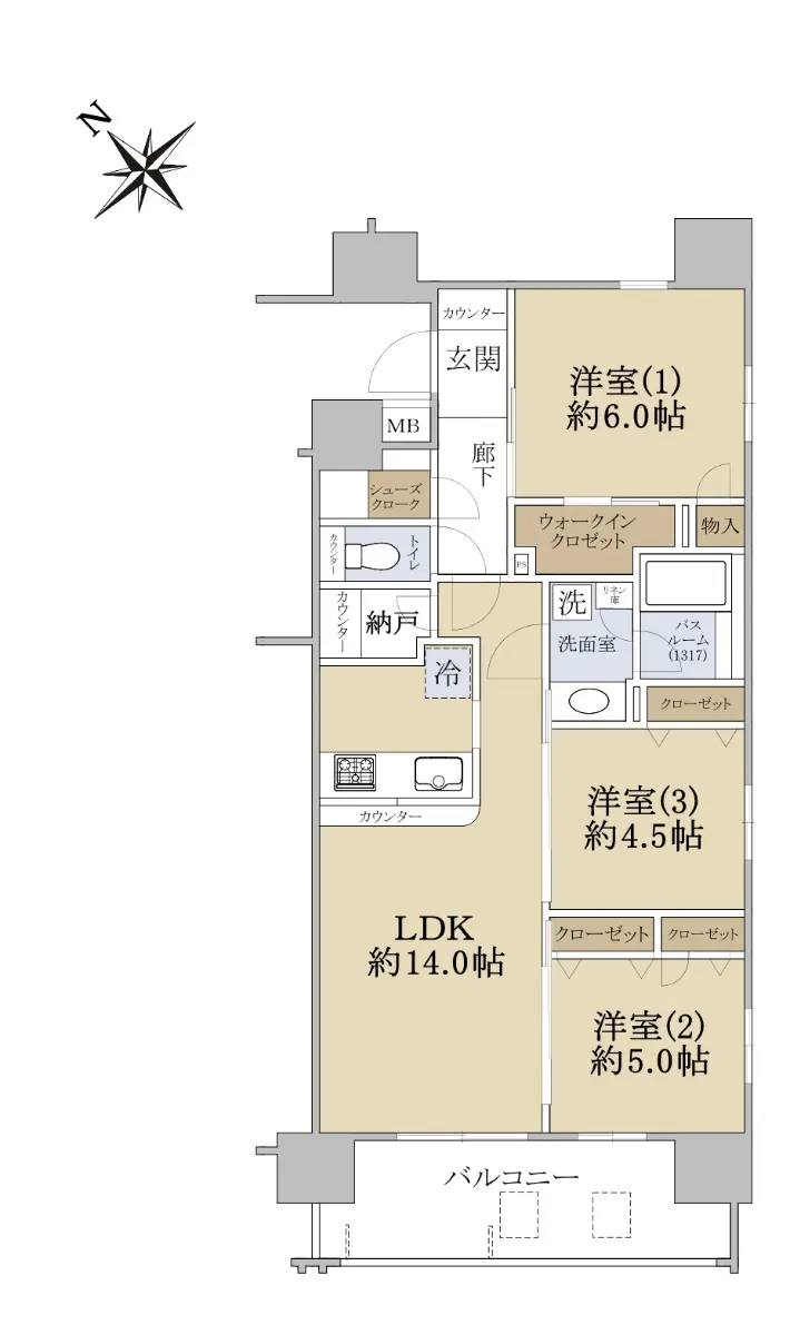 3LDKのファミリータイプで、各居室に収納がございますのでお荷物の多い方に大変便利です。