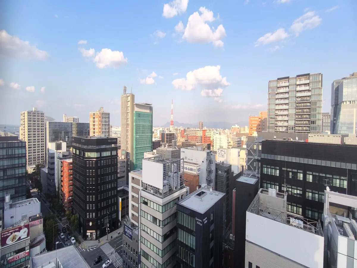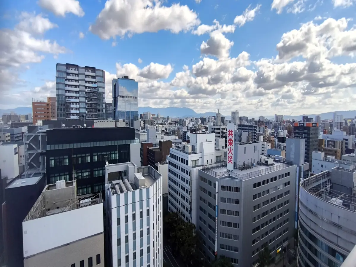 15階東向きのバルコニーは、開放感のある眺望で、奥には天神ビックバンの再開発を感じる大名ガーデンシティ等が見えます。