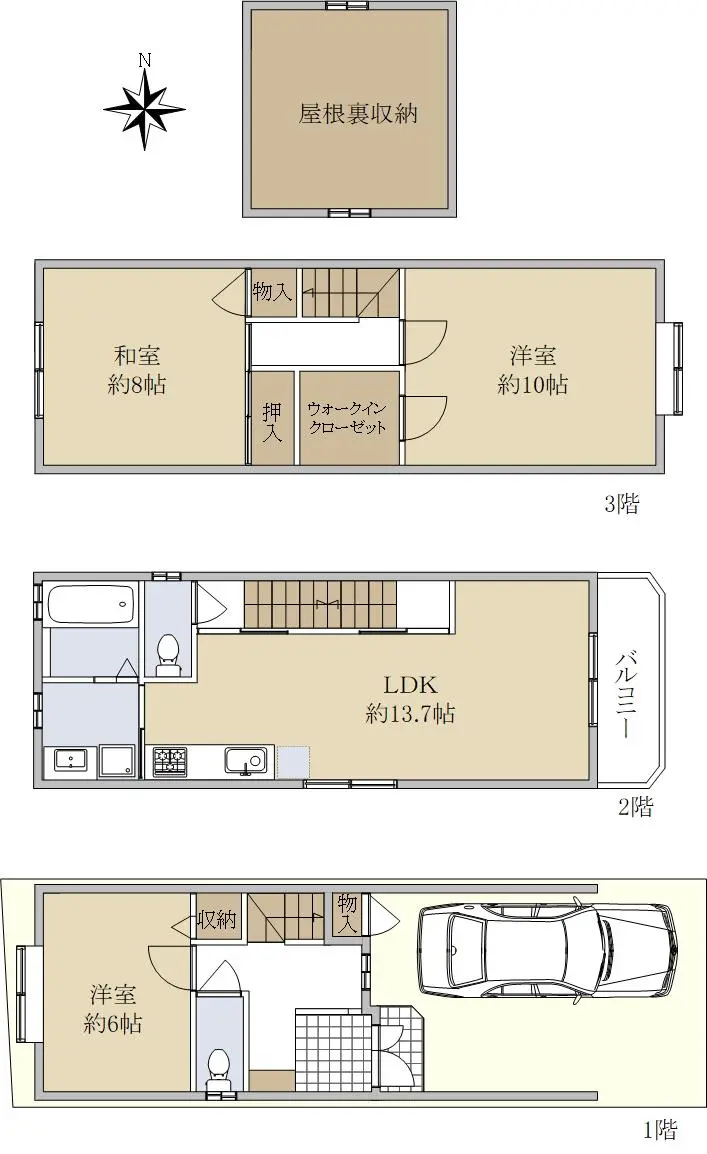 ■建物面積:107.48㎡(1階34.12㎡、2階34.12㎡、3階39.24㎡)