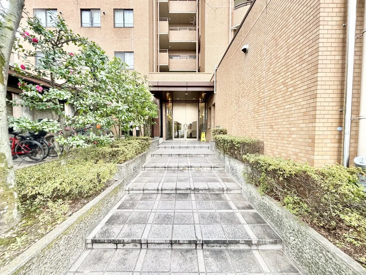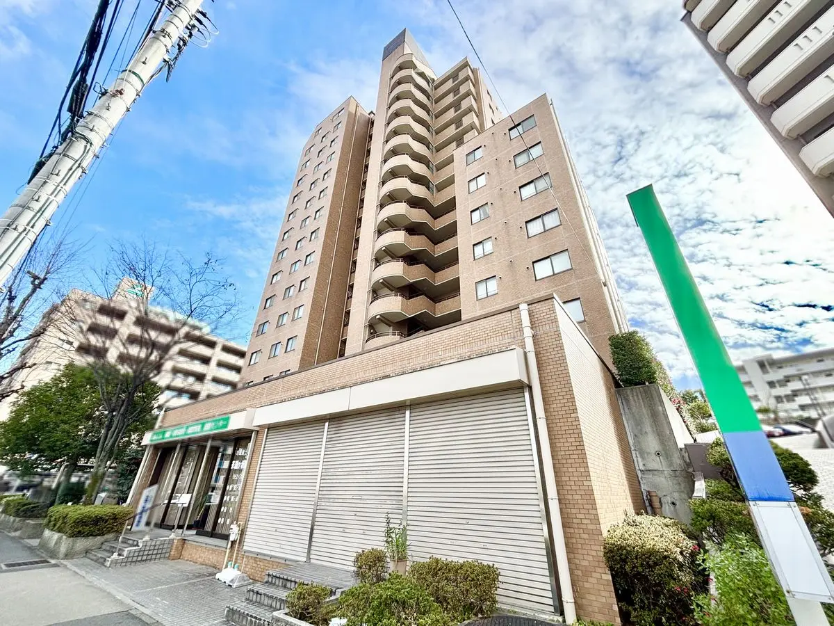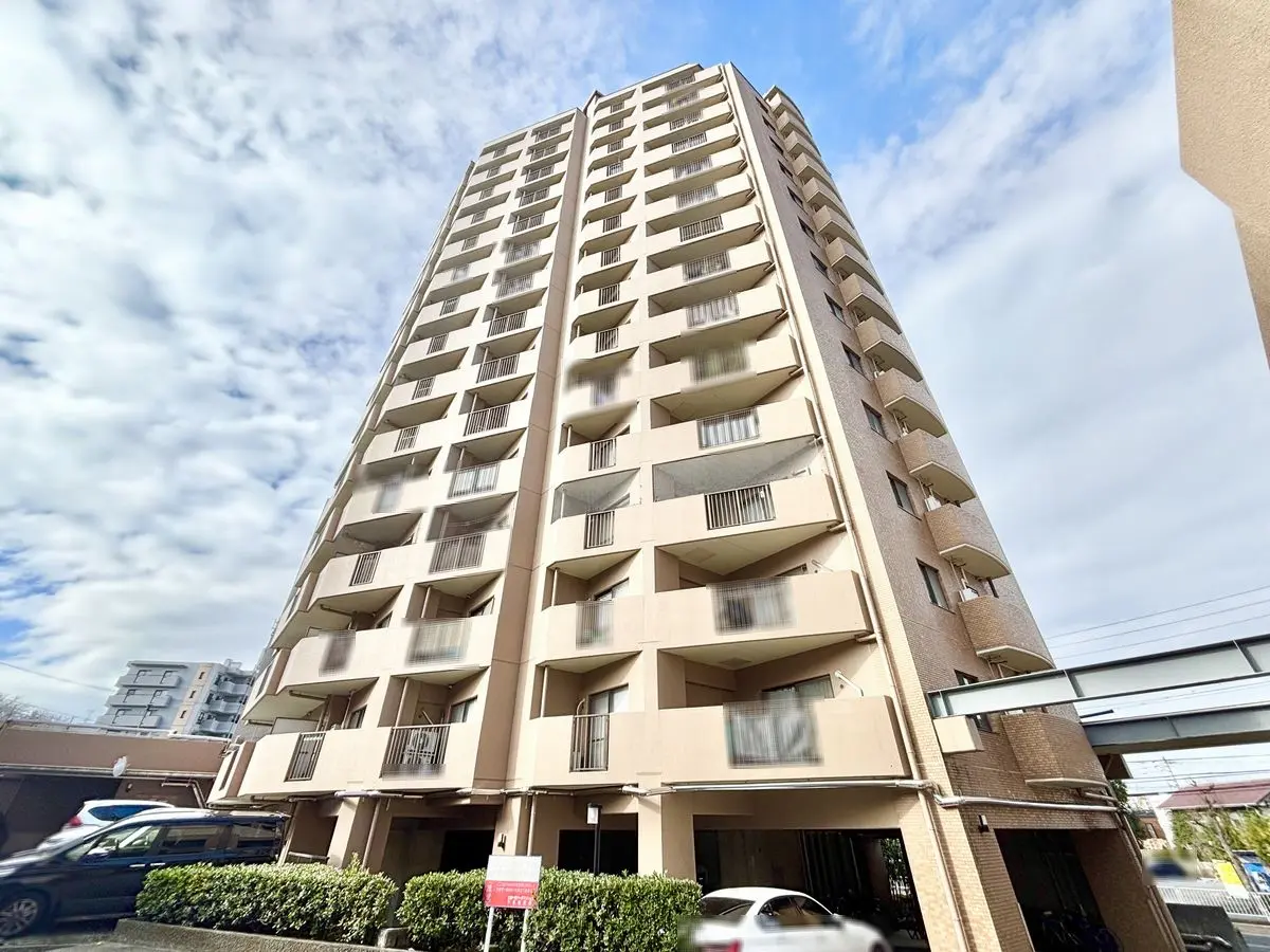 明るいブラウンが目をひく16階建てのマンションでございます。