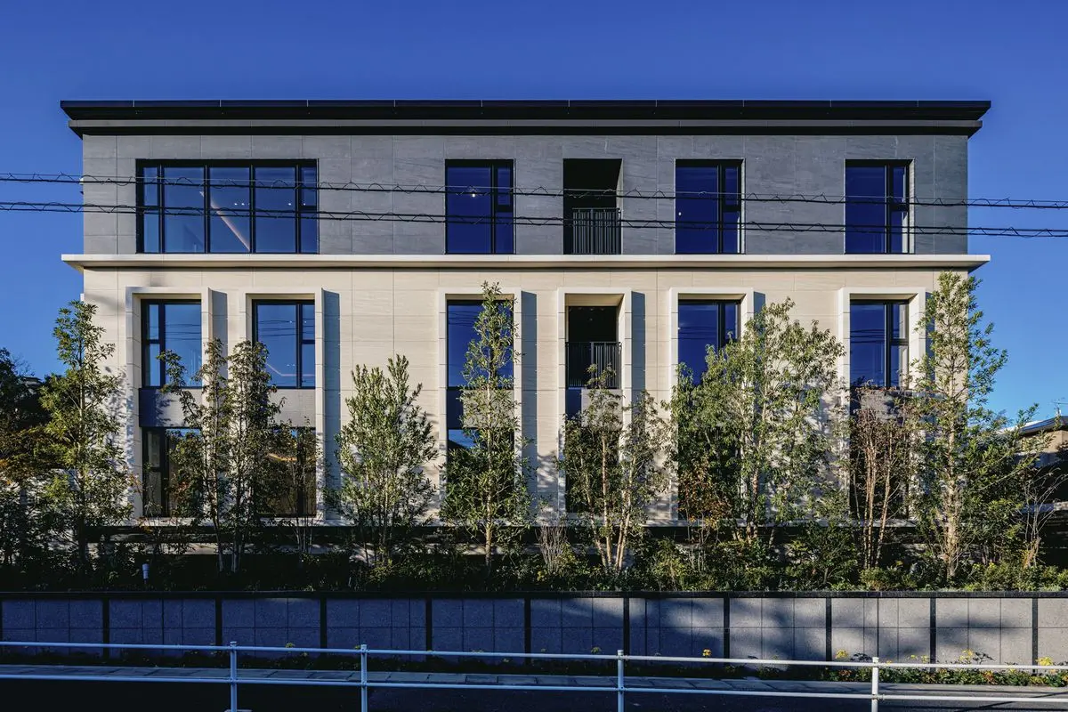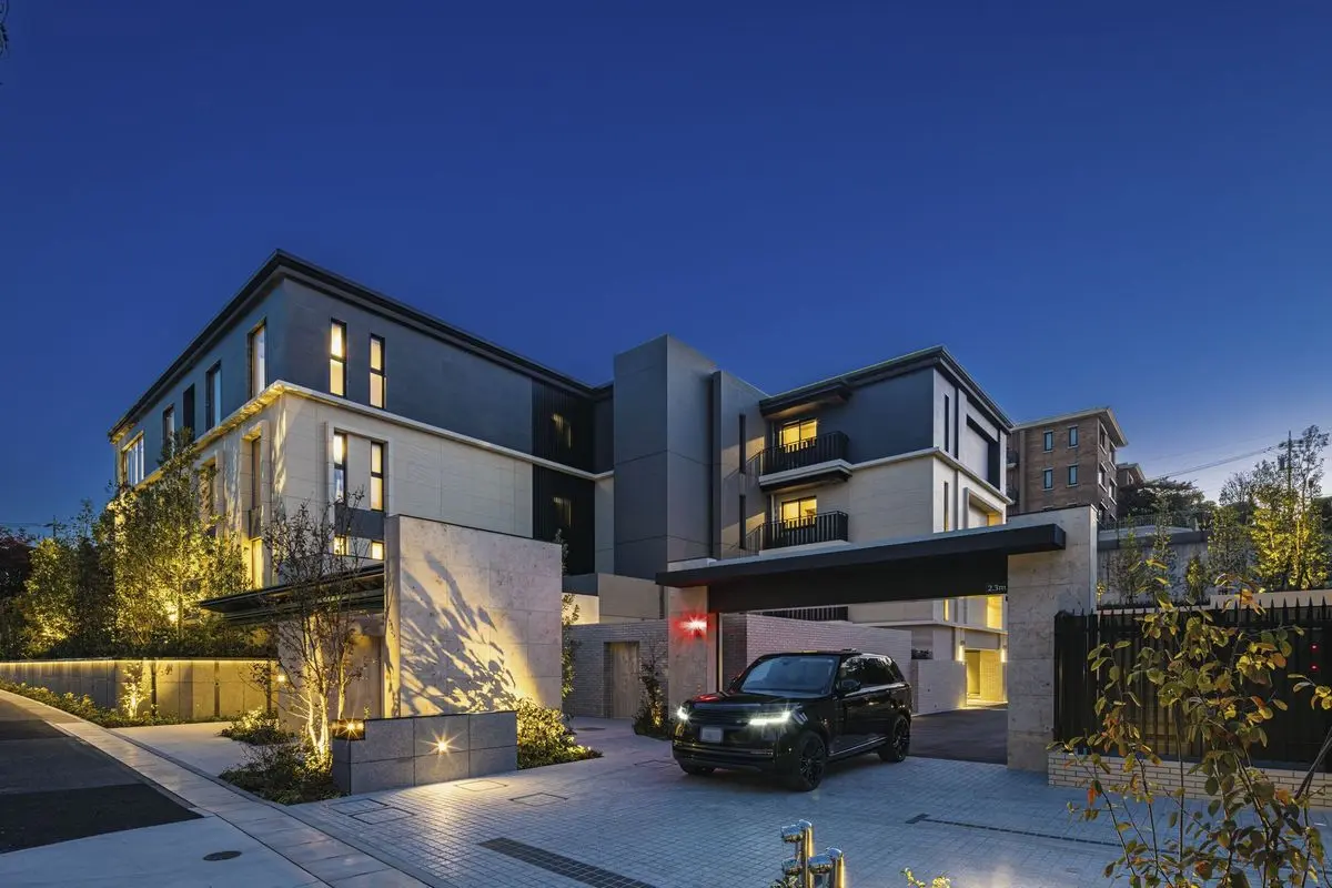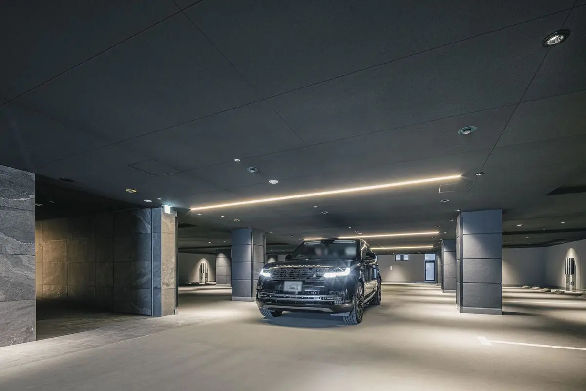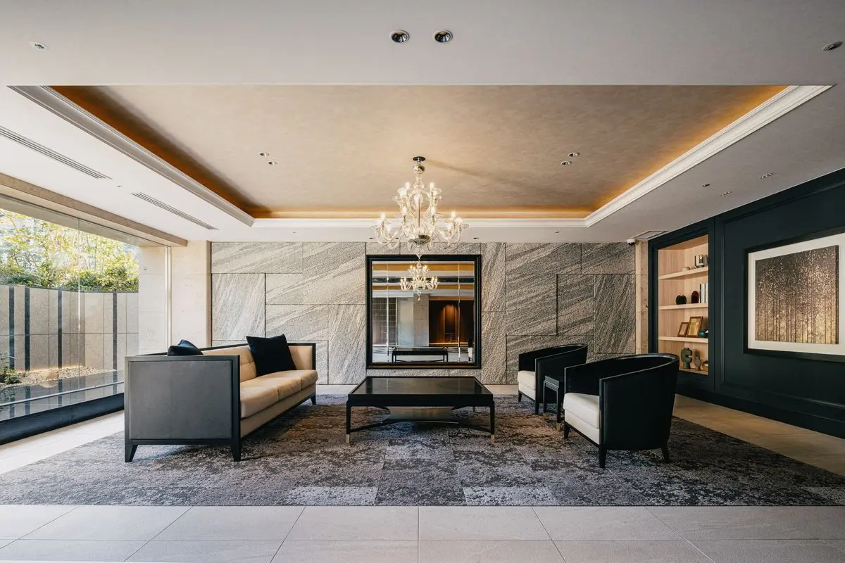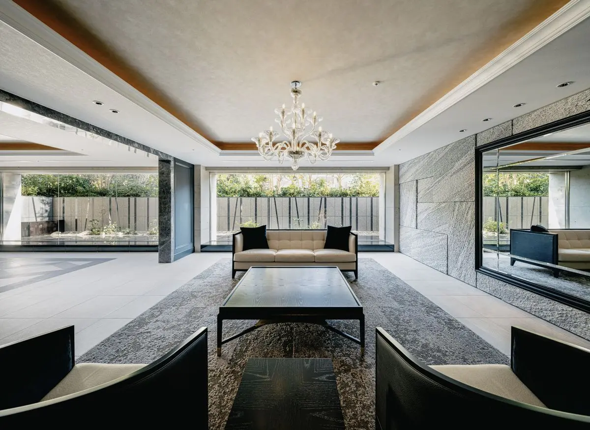 マンションの外壁には天然石や大判タイルが採用されており、