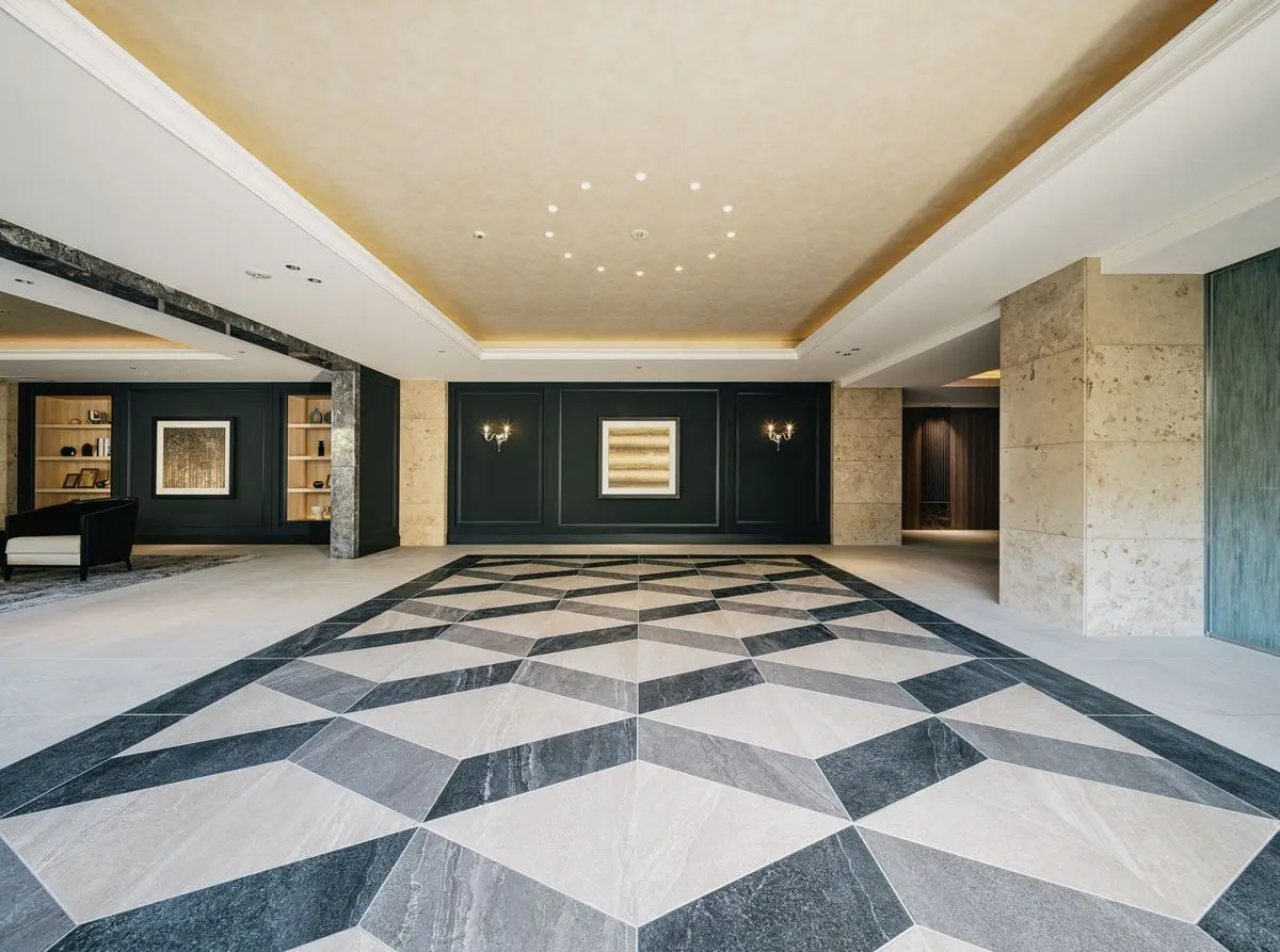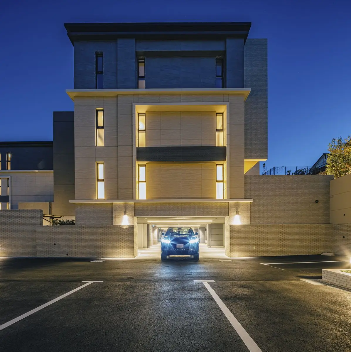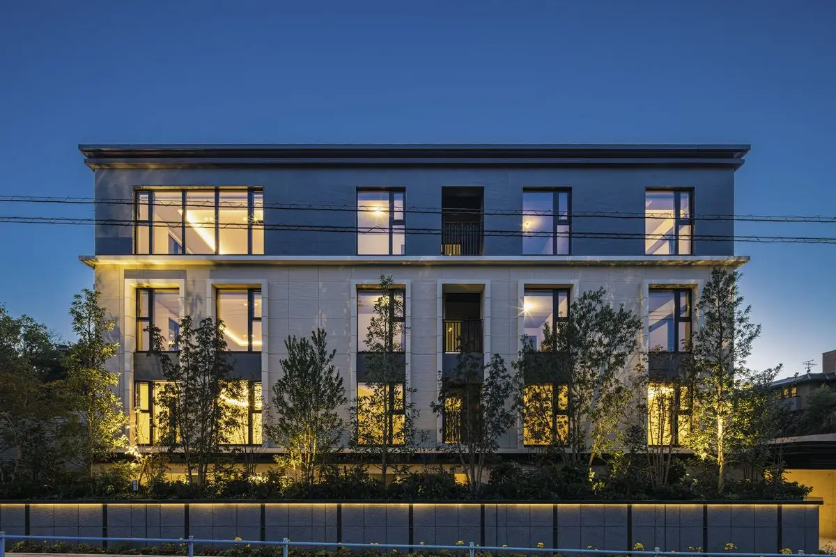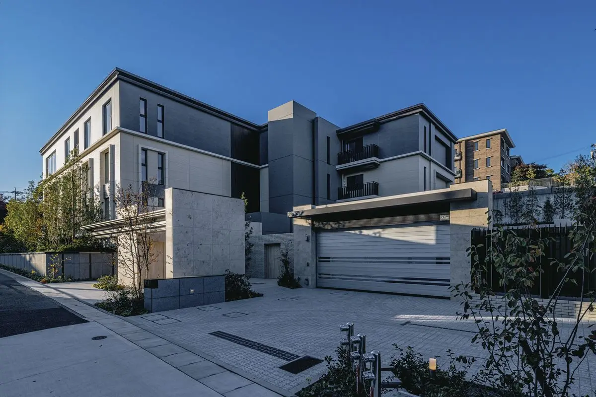 マンションの外壁には天然石や大判タイルが採用されており、